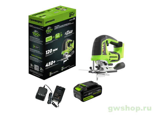 Лобзик аккумуляторный Greenworks GD24JS120 24V, с 1 АКБ 4Ач и ЗУ